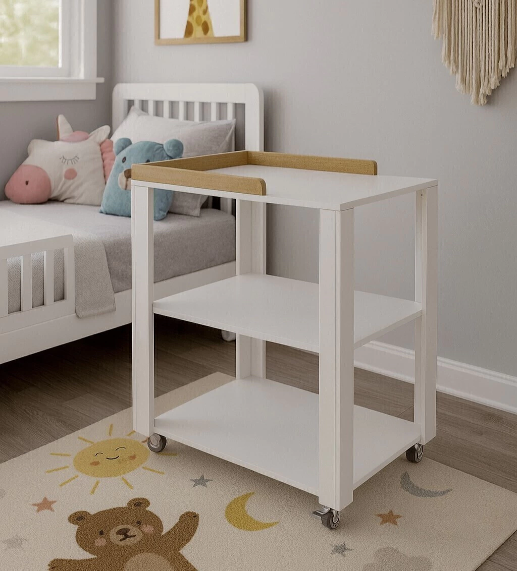 Este mueble cambiador organizador es la solución ideal para cambiar a tu bebé de forma cómoda y segura en cualquier momento. Su diseño práctico incorpora dos estantes amplios, perfectos para mantener a mano todos los productos esenciales como pañales, toallitas y cremas.
